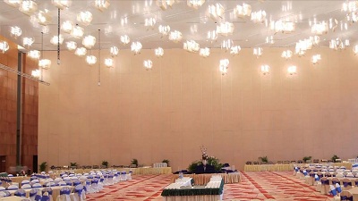 特高類型(標高9m-18m)即可稱為超高型隔斷,是眾多高星級酒店常用的活動隔墻系統,特高隔斷可以起到有效分割宴會廳,會議中心的空間,做到一廳多用,且互不干擾的用途。