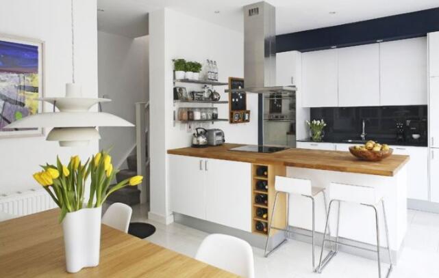 比起普通的隔斷,吧臺更加兼具美觀性與實(shí)用性。在開放式的廚房與客廳中,吧臺美觀又實(shí)用,既能收納物品又能當(dāng)小餐桌,周末還能在吧臺上和朋友一起吃飯喝酒聊天,情趣十足。